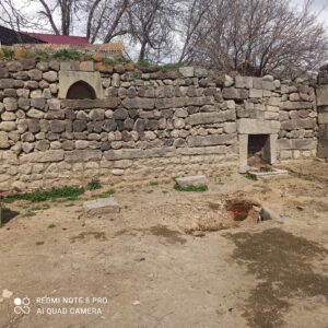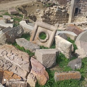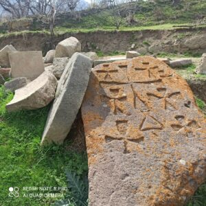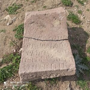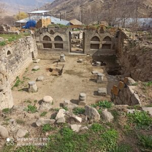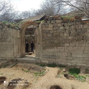 Իշխանական պալատից մոտ քսան մետր դեպի արեւմուտք մեր դեմ բացվում են միջնադարյան եկեղեցու ավերակները։ Դժվար, անգամ անհնար է միանգամից մտքիդ մեջ ամբարել ու պահել այսքան գեղեցիկ, հազվագյուտ ու բազմազան արժեքներ, որոնք իրար վրա կիտված են մի քանի մետր շառավիղ ընդգրկող այս տարածքում։ Մեր շուրջը իրար վրա անկանոն սփռված կամ դարսված են խաչքարերի, տապանաքարերի ամբողջական կամ կոտրված մասեր, նախշազարդ կամ պատկերազարդ շինաքարերի բեկորներ, սյունախարիխսներ, հայատառ արձանագրություններ պարունակող քարեր, որոնցից յուրաքանչյուրը պատմության համար մի բացառիկ վկայարան կամ հիշատակարան է։ Ու մեզ համար նաեւ դժվար է՝ այդքան հեշտորեն բաժանվել հոգեւոր այս գանձերից, որոնք ասես մագնիսի պես ձգում ու իրենց են քաշում մեր հոգիներում բռնկված ոգեւորությունն ու անհագ կարոտը։ Ընթերցում ենք մի վիմագիր արձանագրության բովանդակությունը․ «Հանուն ամենակարող հզորին․․․Հանուն հոր եւ որդվոյն եւ սուրբ հոգւոյն․․․»։