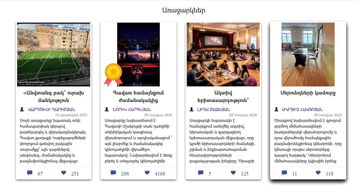 Ինչպես տեղեկացրին Գավառի համայնքապետարանի աշխատակազմից, «Գավառ համայնքի մասնակցային բյուջետավորում-2026» ծրագրի շրջանակներում համայնքի ակտիվ երիտասարդների և երիտասարդական կազմակերպությունների կողմից ներկայացվել էին 9 ծրագրային առաջարկներ, որոնցից նախնական գնահատման արդյունքում քվեարկության փուլ էին անցել 4-ը։ Քվեարկության արդյունքներով ներկայացված նախագծերը ստացել են հետևյալ արդյունքները՝ «Գավառ համայնքում ժամանակակից կինոդահլիճի կապիտալ վերանորոգում»՝ 24,321 դիտում , 4,168 հավանում, «Անվտանգ բակ՝ ուրախ մանկություն Կաբելագործների փողոցում»՝ 3,459 դիտում, 251 հավանում, «Ակտիվ երիտասարդություն՝ կենսուրախ համայնքի համար»՝ 612 դիտում, 125 հավանում, «Սերունդների կամուրջ»՝ 661 դիտում , 118 հավանում։