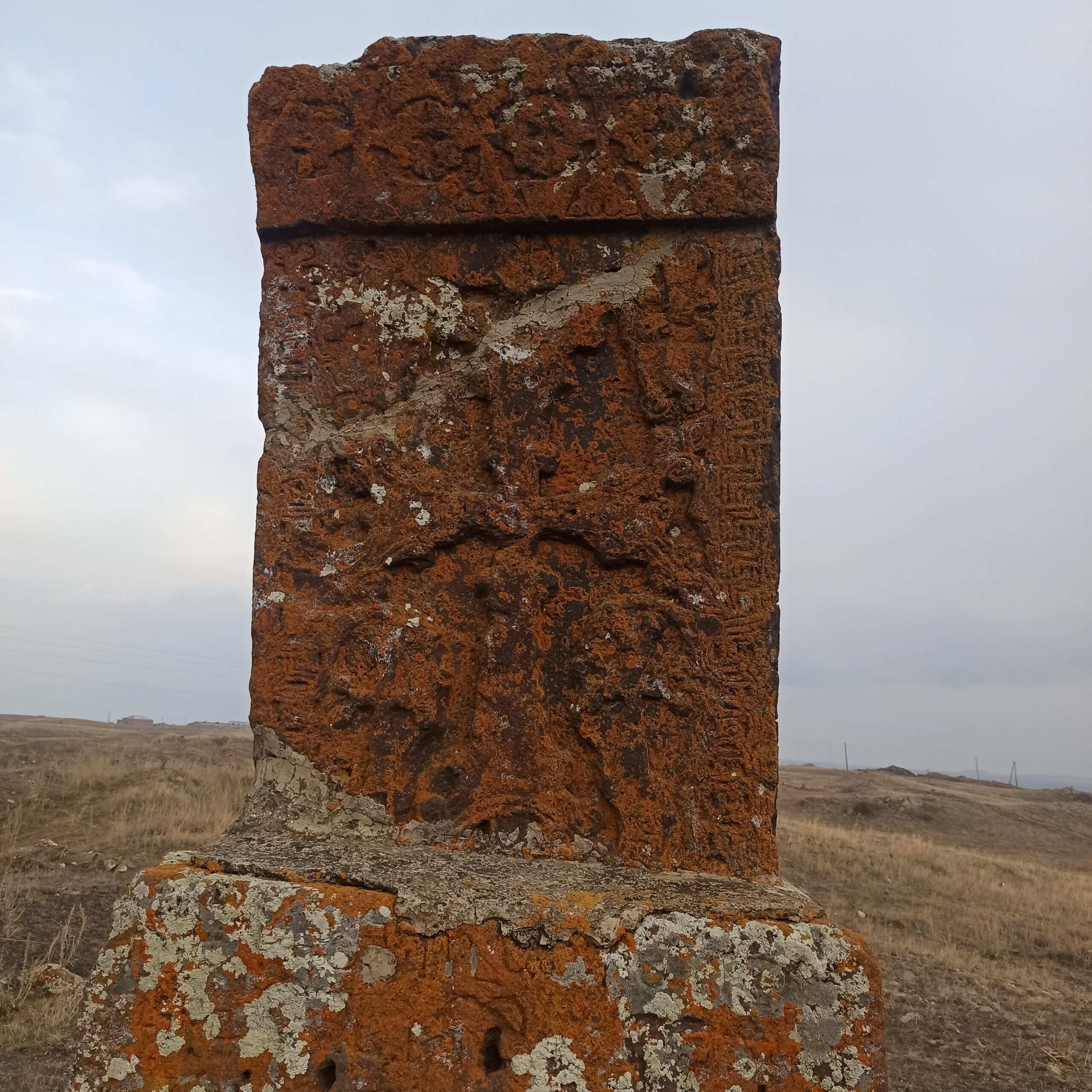«Խաչքար, մեծ եւ գեղաքանդակ, կանգնած է խճուղու եզրին, նորաշեն աղբյուրի եւ ճաշարանի մոտ, որտեղից ճանապարհները խճուղուց բաժանվում են դեպի Լճափ եւ Բերդկունք գյուղերը։ Իր տեղումն է պատվանդանը եւ նրա վրա խաչքարի ստորին մասի մի փոքր կտոր․ վերեւի մեծ մասը մի քանի կտորներով ընկած է շուրջը, մի մեծ բեկորի վրա, որը խաչքարի հյուսիսային կողմն է, մնացել է 11 կարճ , եւ մի փոքրի վրա, որը վերին մասն է՝ 2 տող, մնացածը՝ խաչքարի տակ եւ պատվանդանի վրա․ « Ի թիվս ՉԻԳ /1274/ Ես ՄՈՒԱՏԱՅՍ ԿԱՆԿՆԵՑԻ ԶԽԱՉՍ․ ՈՐՔ ԵՐԿԻՐ ՊԱԳԱՆԷՔ ԱՍՏՎԱԾ ՈՂՈՐՄԻ ԱՍԱՑԷՔ ԻՆՁ ԵՎ ԾՆՈՂԱՑ ԻՄՈՑ»